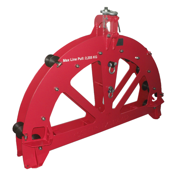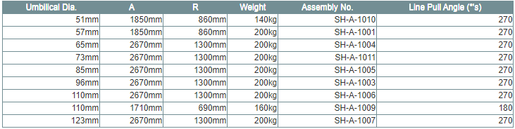The sheave has the facility to allow the umbilical to be fitted and removed while the sheave is suspended, this is achieved by use of a hinged section to one side of the lift point. Large diameter nylon rollers having a spherical section are used to provide full support the umbilical section thus preventing any crushing effect on the inner lines. The lower, load bearing rollers are fitted with ball bearing cartridges and provided with grease nipples. All rollers run on stainless steel shafts, the top set have quick action sprung fixtures that allow full assess to the umbilical in a mater of seconds.